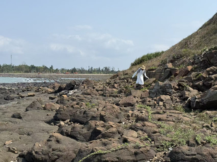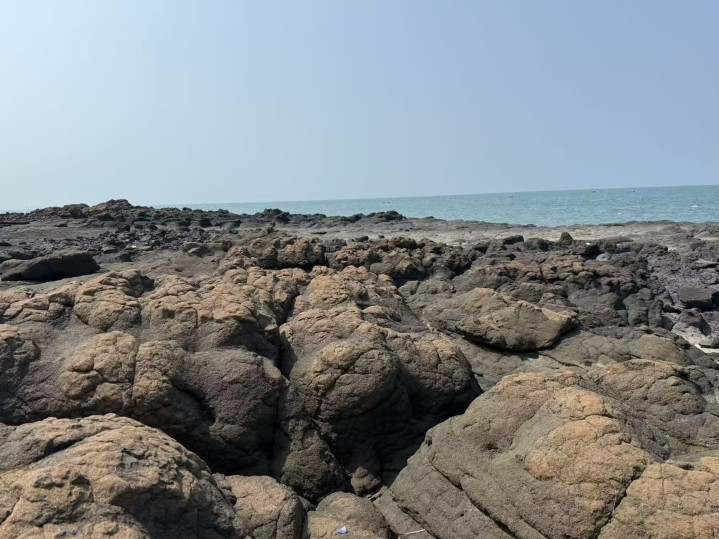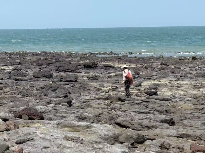 一群旅客从海滩上直接走往常了,脚印歪倾斜斜地印在礁石间的沙地上。惟有咱们莫得走那条捷径,而是寻了落潮浮现的步说念——说是步说念,其实不外是一长条稍许平整些的礁石脊,拼凑看得出是路的形状。