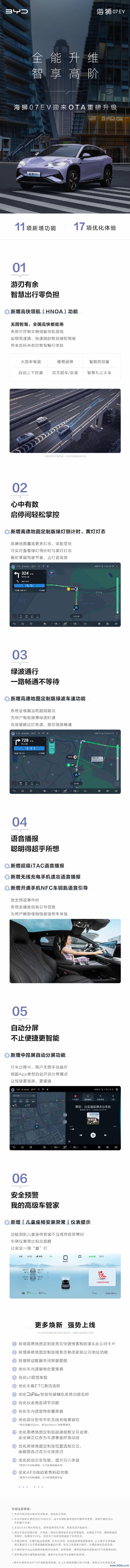 易车讯 10月8日,比亚迪官方晓喻海狮07 EV将迎来OTA升级,本次升级包含11项新增以及17项优化,10月8日起不绝推送,新增高快领航(HNOA)、中控屏自动分屏等功能。官方指示,这次升级时长预估为52分钟,具体升级时长以车机指示为准。