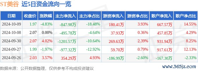 本站讯息,逝世2024年10月9日收盘,ST好意思谷(000615)报收于1.97元,下落4.83%,换手率3.04%,成交量23.15万手,成交额4589.33万元。
