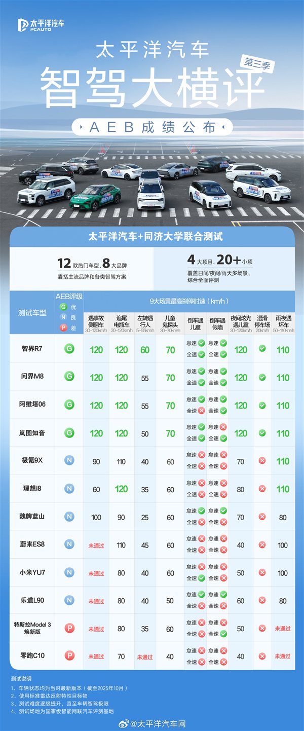 快科技11月14日音问,近期,太平洋汽车网举办了第三季“智驾大横评”,并至当天公布了多车AEB测试收货。