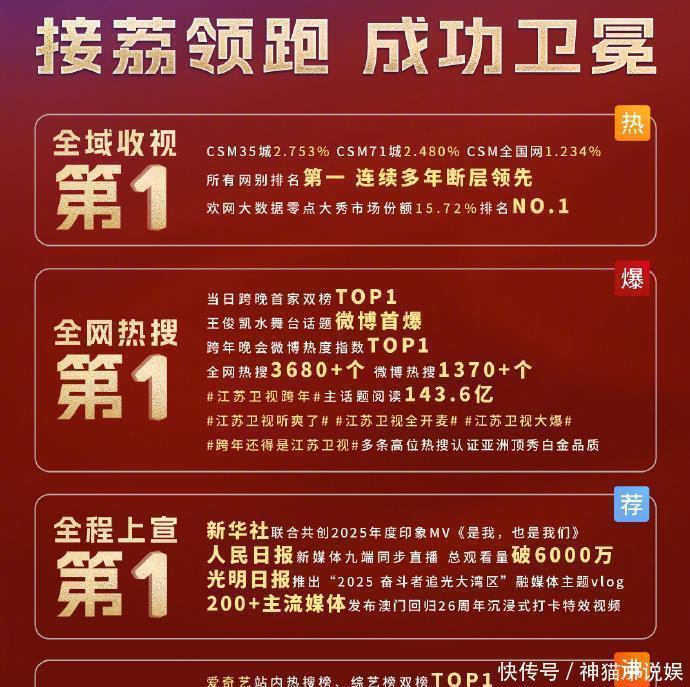 江苏卫视也出头出头,发了一份漂亮的成绩单,“告捷卫冕”这几个字看着挺扎心,从数据上看,江苏卫视稳稳拿下了全域收视第一、全网热搜榜冠军、全站互动第一等多个第又名。