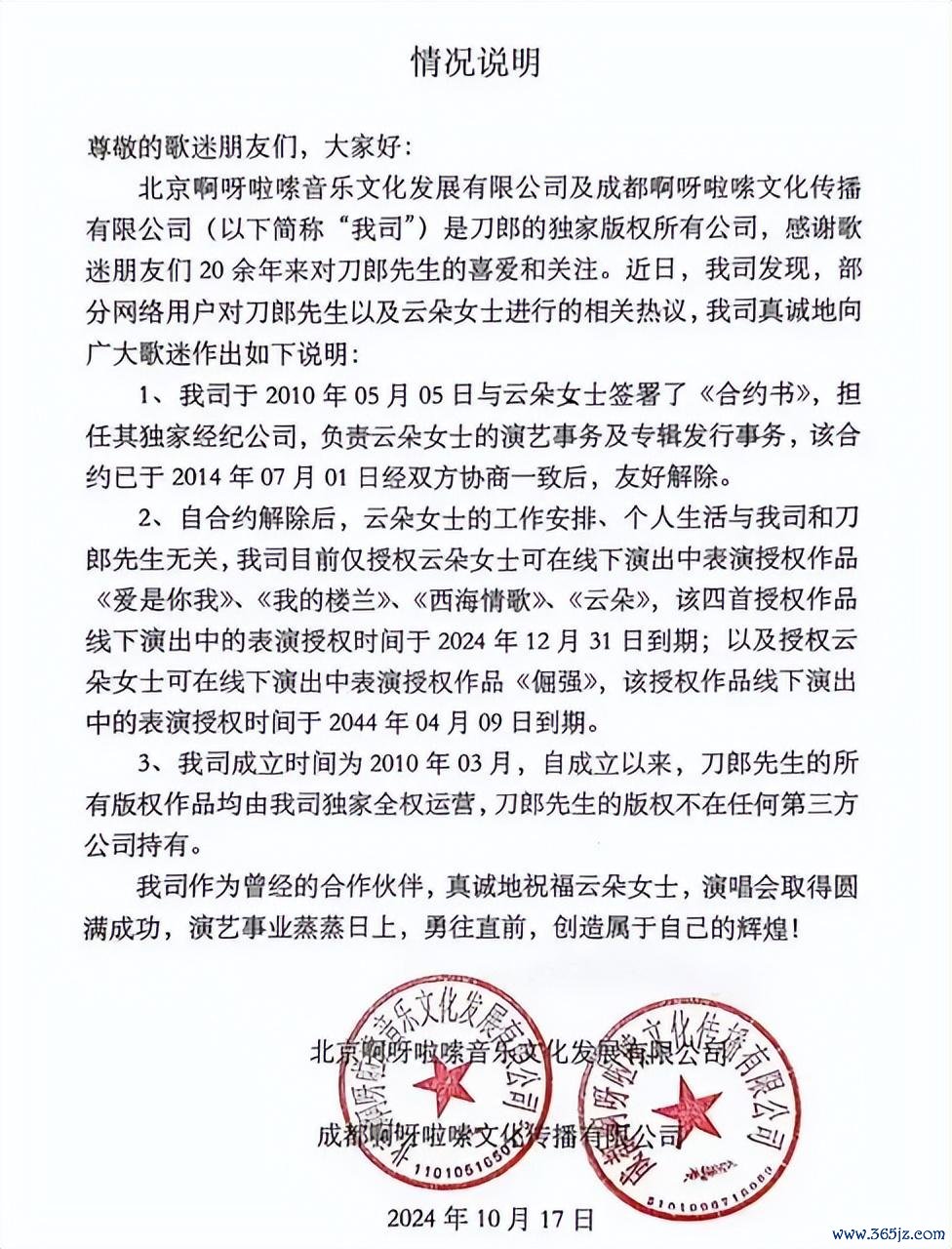 更灾祸的是,10月17日,刀郎场合的经纪公司,即北京啊呀啦嗦文化有限公司官方账号发出声明:10年前,刀郎就和云朵分说念扬镳了,云朵的几首代表作本年年底就失去了演唱权!