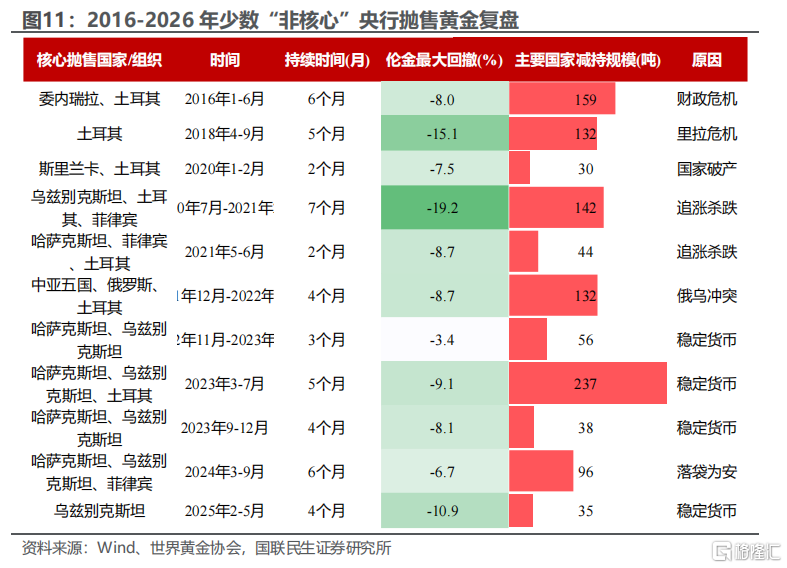 其四,“非中枢”央行短期“战术性”抛售黄金,不影响黄金恒久高涨趋势。以2016-2026年好意思元信用弱化阶段为例,宇宙央行黄金储备累计净增3517吨,短期土耳其、中亚5国、菲律宾等“非中枢”央行抛售黄金诚然在短期内对金价形成了一定的回撤(参考图11),然则并莫得逆转2016-2026年金价高涨的大趋势。