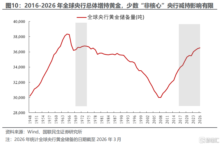 其三,即使宇宙中枢央行恒久“计谋性”抛售黄金,金价亦可高涨。如图7-8所示, 1977-1979年、1999-2008年恰刚正于好意思元信用弱化阶段(阶段差别智力参考上段),即使好意思国、欧盟等中枢经济体大畛域抛售黄金,黄金依然走出高涨趋势。在好意思元信用弱化的前提下,2026年2-3月即使部分央行“减捏”导致金价短期“一波又起”,但高涨趋势或并未逆转。