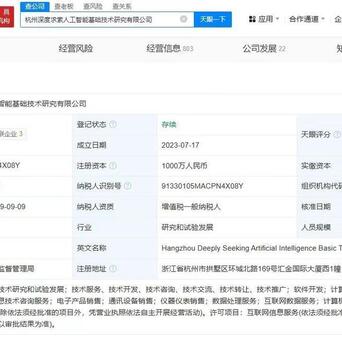 杭州深度求索东谈主工智能基础本领量度有限公司修复于2023年7月,法定代表东谈主为裴湉,注册老本1000万东谈主民币,谋划领域包括野情绪系统做事、信息系统集成做事、东谈主工智能利用软件开拓等开云(中国)kaiyun网页版登录入口,由梁文锋偏激名下宁波程恩企业处分商议合股企业(有限合股)共同合手股。
