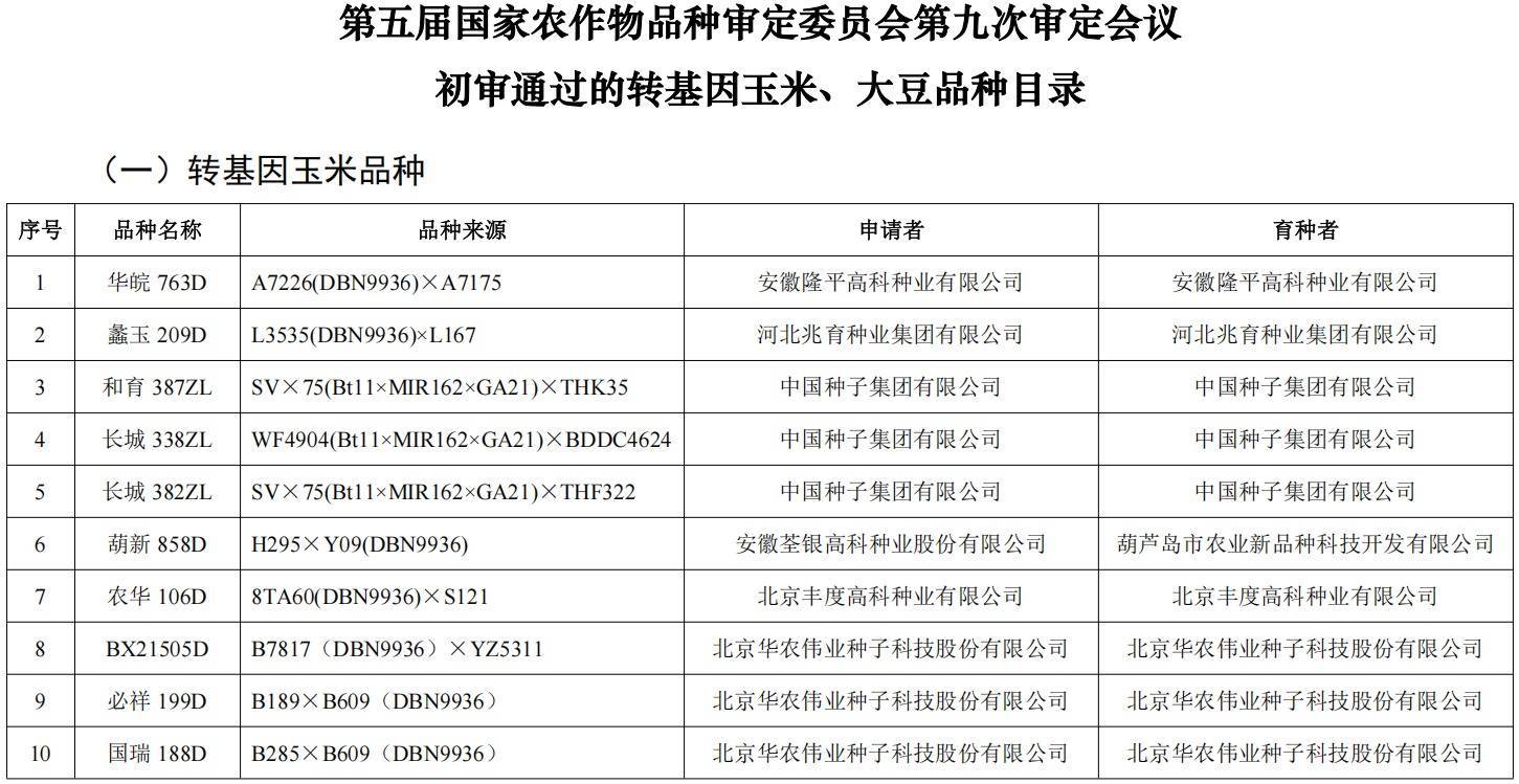 公示名单败露,本次共有97个转基因玉米品种、2个转基因大豆品种通过初审,在这批名单中,触及大败农、隆平高科、登海种业、丰乐种业等多家上市公司。